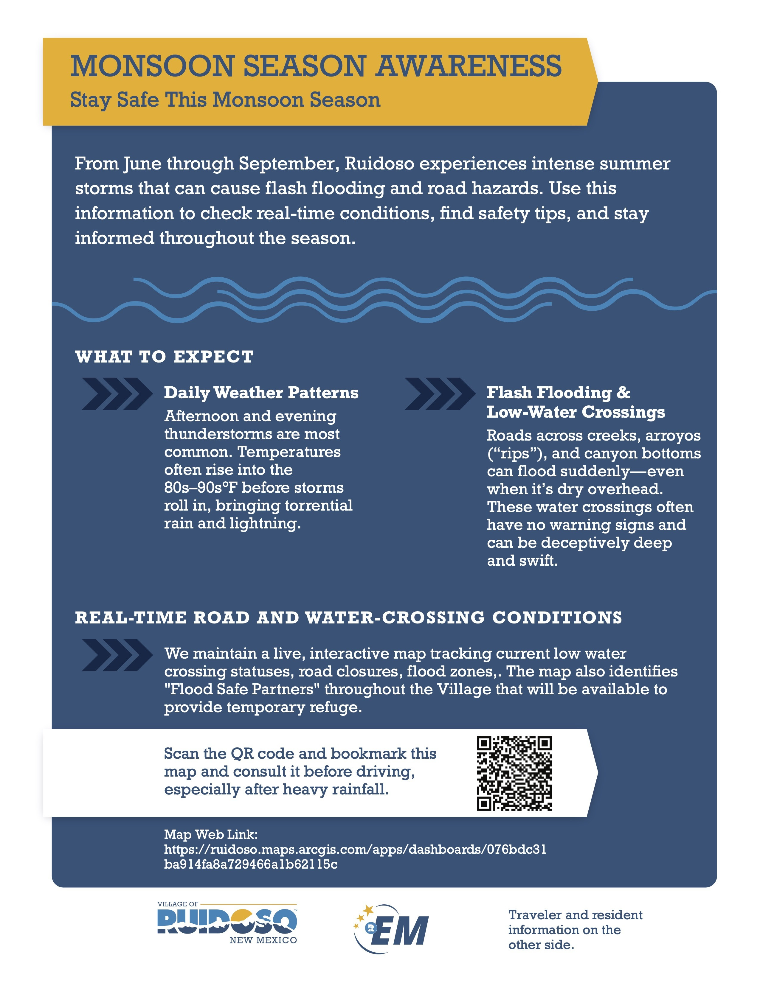 Everyone knows the Village of Ruidoso is fun! Not everyone knows if it's safe. Fortunately, it is! There is no need to skip your trip or plan it elsewhere. Shops, restaurants and our locals await you with open arms. Here's what you need to know: We are in monsoon season, which naturally means rain. The only time rain is a concern is when it rains over the burn scar from year's fires. When that happens, there will be some flooding. Luckily, there was a lot of mitigation done in anticipation for this. And, it's holding up well. Most of the rushing water videos you may have seen are what would have been flood waters, but are actually being diverted into the river. So, what do you do? How can you still have a blast in the Village during these intermittently wet times? First, remember, they are intermittent. When there is flooding, it generally happens mid day. So, enjoy the mornings and do all the things you typically would. And, if happens to be a day when we are going to get the mid-day rain, plan on settling in somewhere like a great restaurant or pub for lunch. Luckily, the showers tend to come around lunchtime. And, because of the mitigation and fast-acting emergency crews, everything is generally back to status quo in about 30 minutes to 2 hours at which time you resume your activities for that afternoon and evening. It really is as simple as that! It's a good idea to sign up for alerts while you're here, because you will likely be having so much fun you won't notice some extra clouds in the sky. It's very easy to do and you can do that at Call Me Ruidoso. In addition, please have a look at the flyers we have for you and visit the link on the QR code. Remember, we want you to be confident that you will be safe, while you're having fun. And, with just a couple of extra steps you can do just that. In fact, you will likely have your best trip ever! |